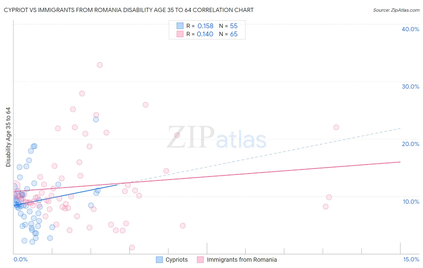 Cypriot vs Immigrants from Romania Disability Age 35 to 64 Correlation Chart