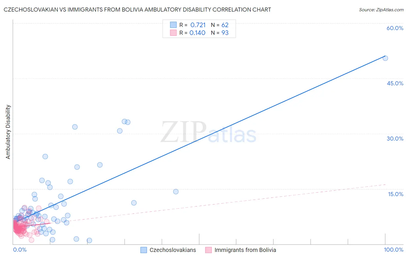 Czechoslovakian vs Immigrants from Bolivia Ambulatory Disability Correlation Chart