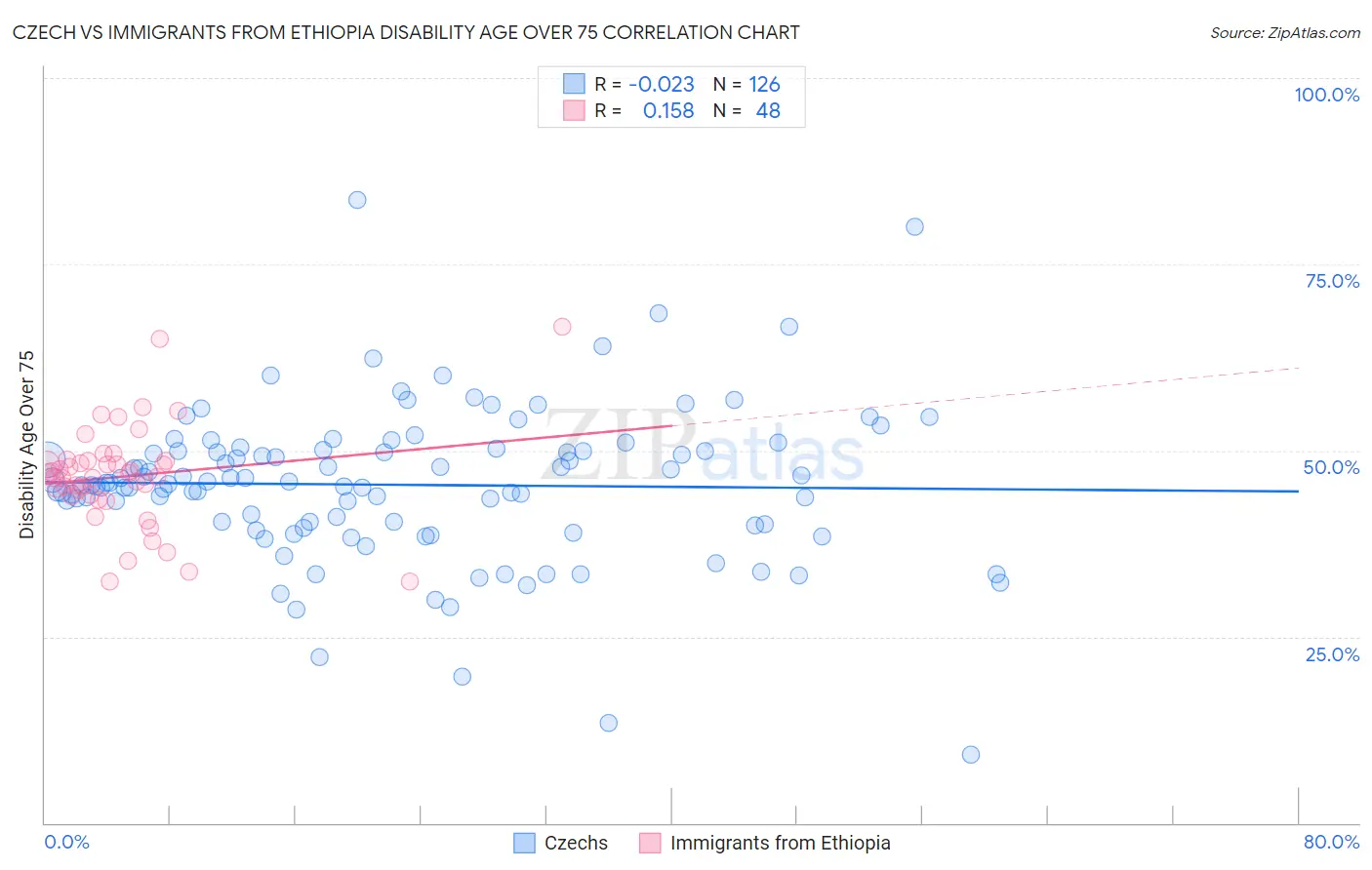 Czech vs Immigrants from Ethiopia Disability Age Over 75 Correlation Chart