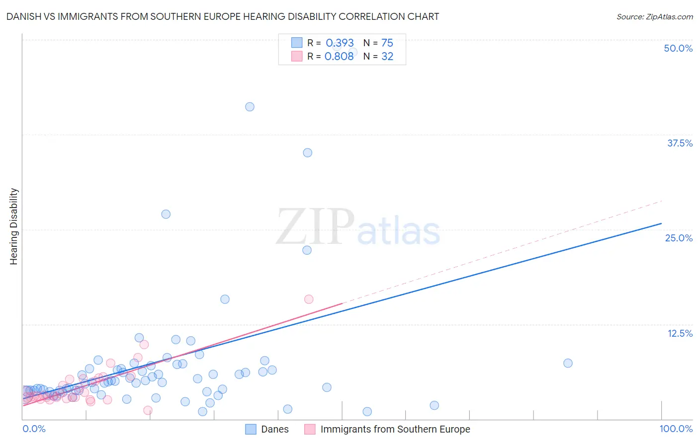 Danish vs Immigrants from Southern Europe Hearing Disability Correlation Chart