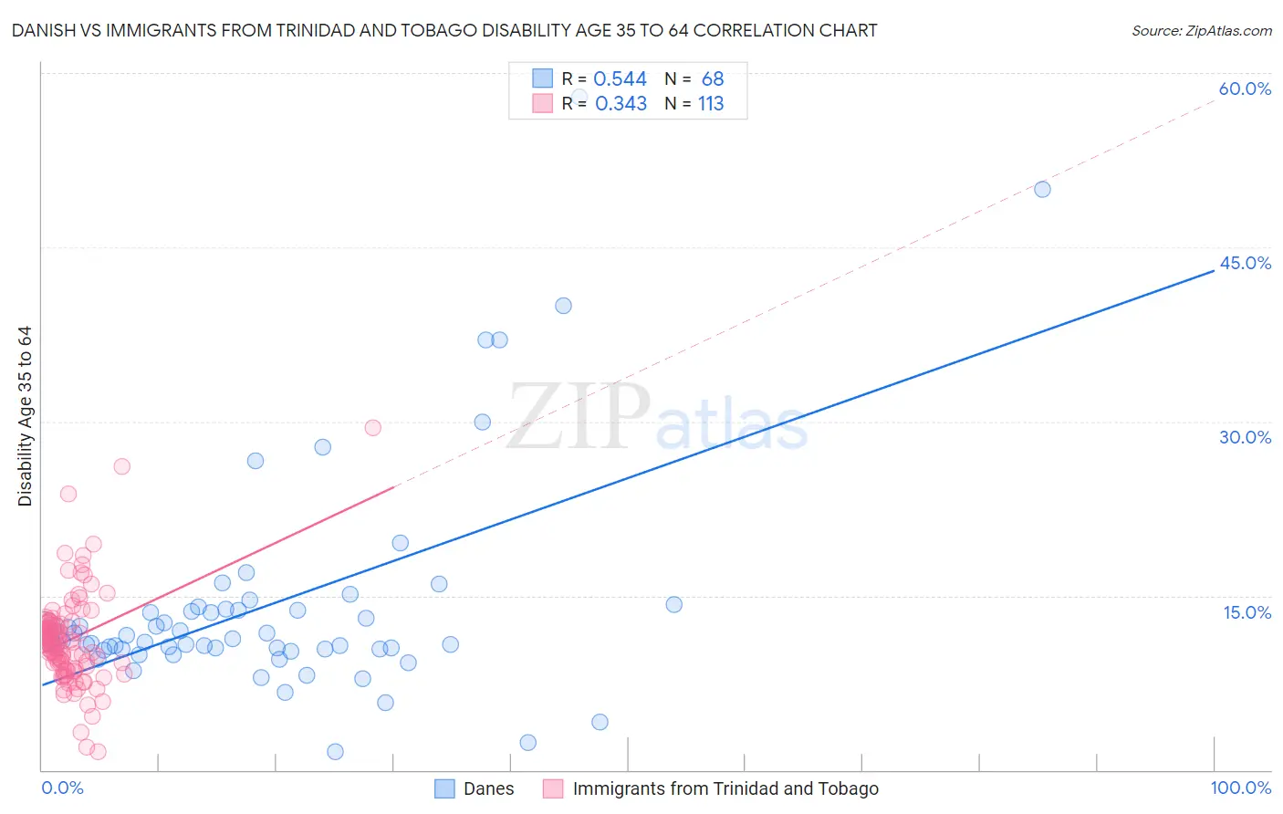 Danish vs Immigrants from Trinidad and Tobago Disability Age 35 to 64 Correlation Chart