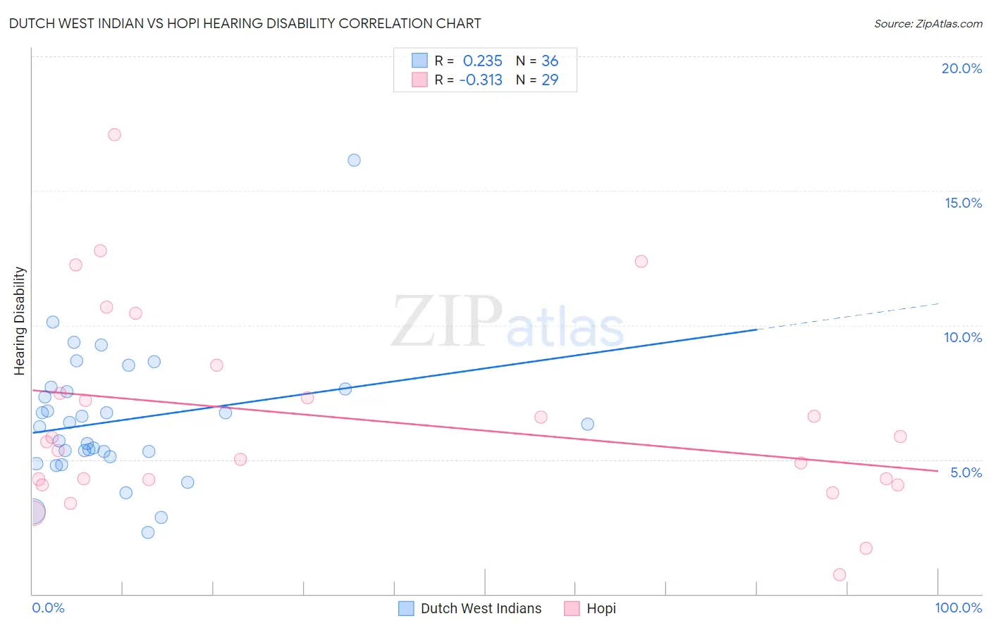 In terms of hearing disability, the demographic groups most similar to Dutch West Indians are Houma (4.2%, a difference of 0.59%), Cherokee (4.2%, a difference of 1.3%), Native/Alaskan (4.2%, a difference of 1.4%), Crow (4.2%, a difference of 2.2%), and Tohono O'odham (4.2%, a difference of 2.2%). Similarly, the demographic groups most similar to Hopi are Yakama (3.9%, a difference of 0.17%), Puget Sound Salish (3.9%, a difference of 0.18%), Spanish American (4.0%, a difference of 0.38%), Comanche (4.0%, a difference of 0.51%), and Cheyenne (4.0%, a difference of 0.69%).