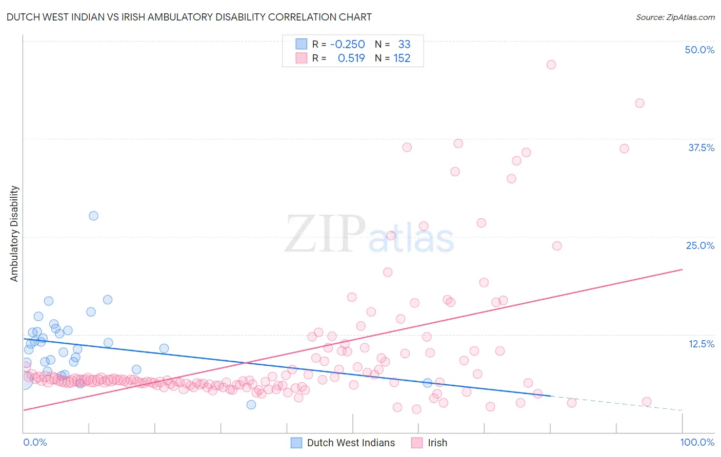 The statistical analysis conducted on geographies consisting of 85,765,361 people shows a weak negative correlation between the proportion of Dutch West Indians and percentage of population with ambulatory disability in the United States with a correlation coefficient (R) of -0.250 and weighted average of 8.2%. Similarly, the statistical analysis conducted on geographies consisting of 579,881,456 people shows a substantial positive correlation between the proportion of Irish and percentage of population with ambulatory disability in the United States with a correlation coefficient (R) of 0.519 and weighted average of 6.6%, a difference of 24.5%.