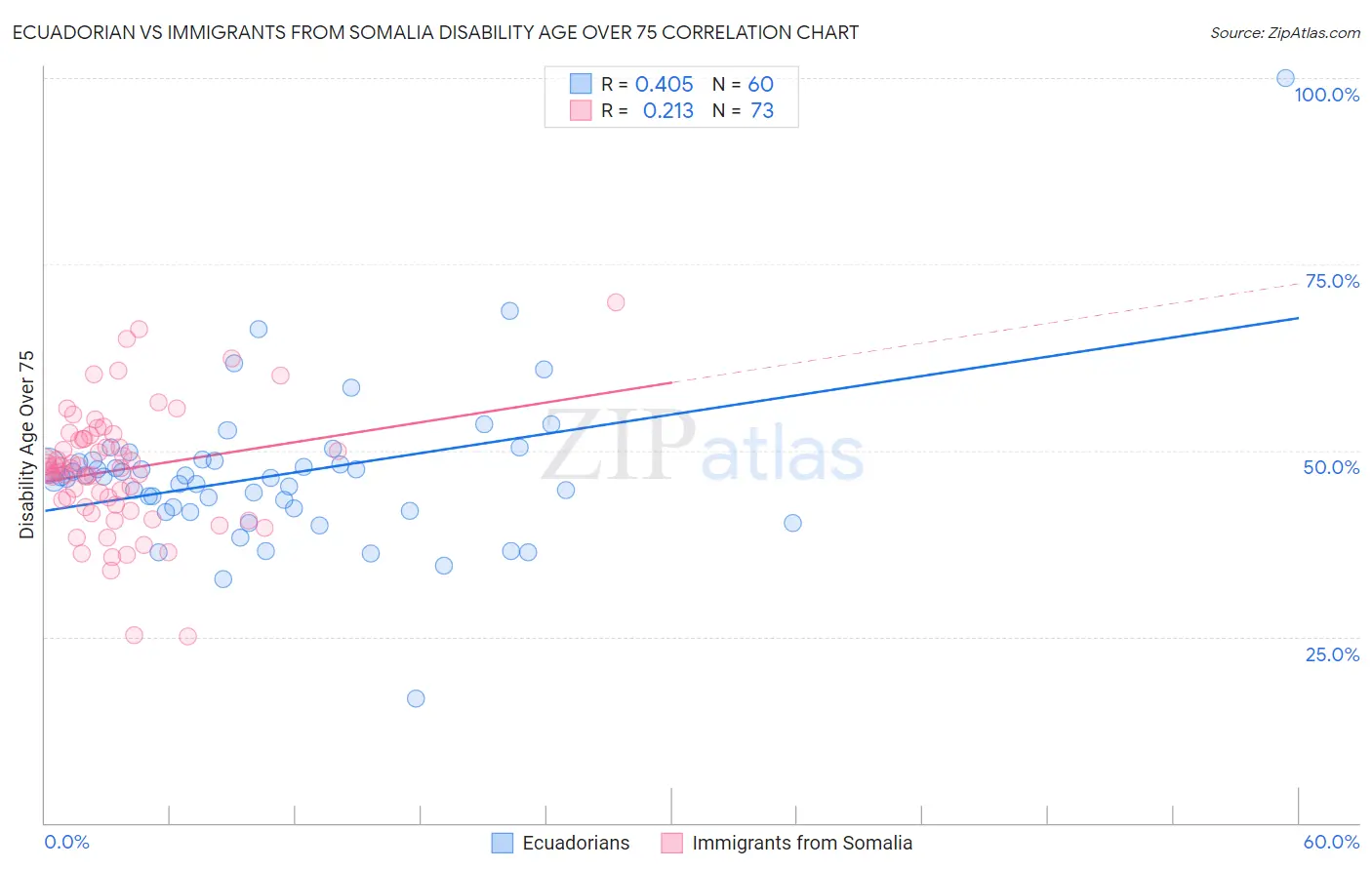Ecuadorian vs Immigrants from Somalia Disability Age Over 75 Correlation Chart