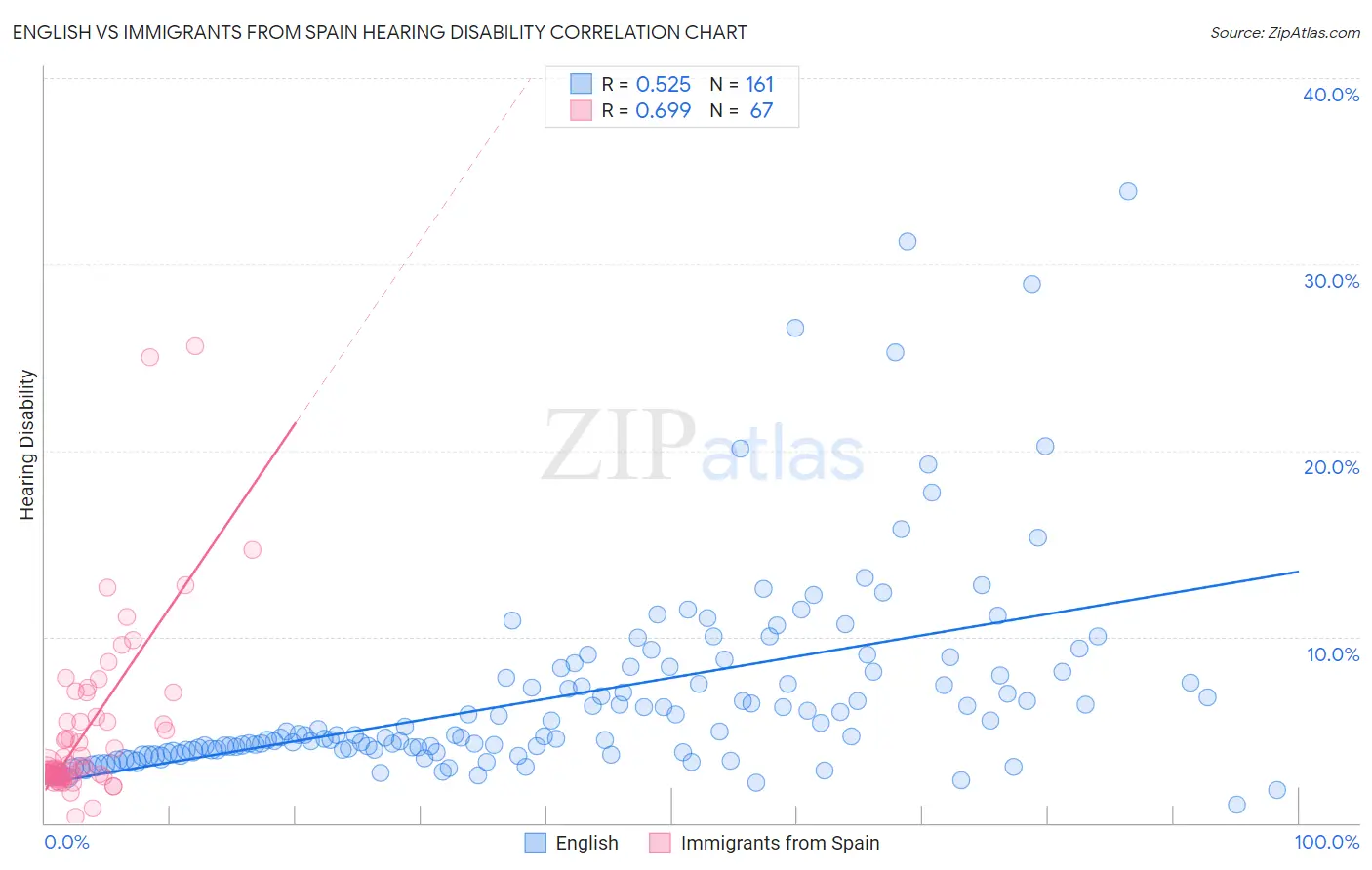 English vs Immigrants from Spain Hearing Disability Correlation Chart