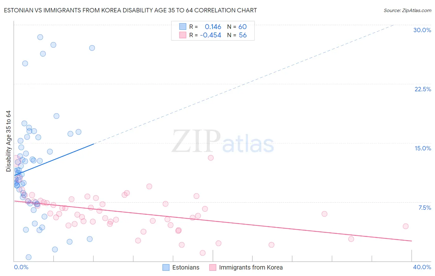 Estonian vs Immigrants from Korea Disability Age 35 to 64 Correlation Chart