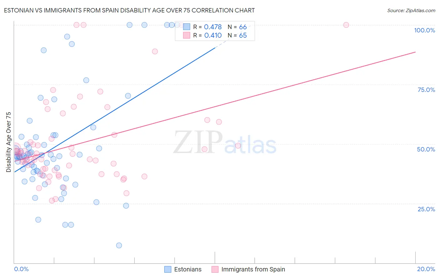 Estonian vs Immigrants from Spain Disability Age Over 75 Correlation Chart