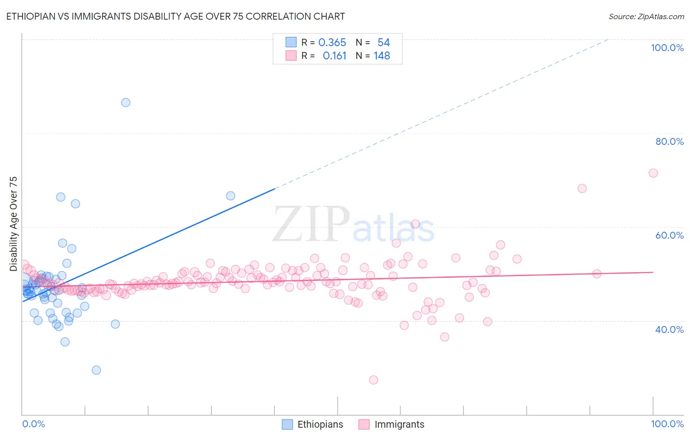 Ethiopian vs Immigrants Disability Age Over 75 Correlation Chart