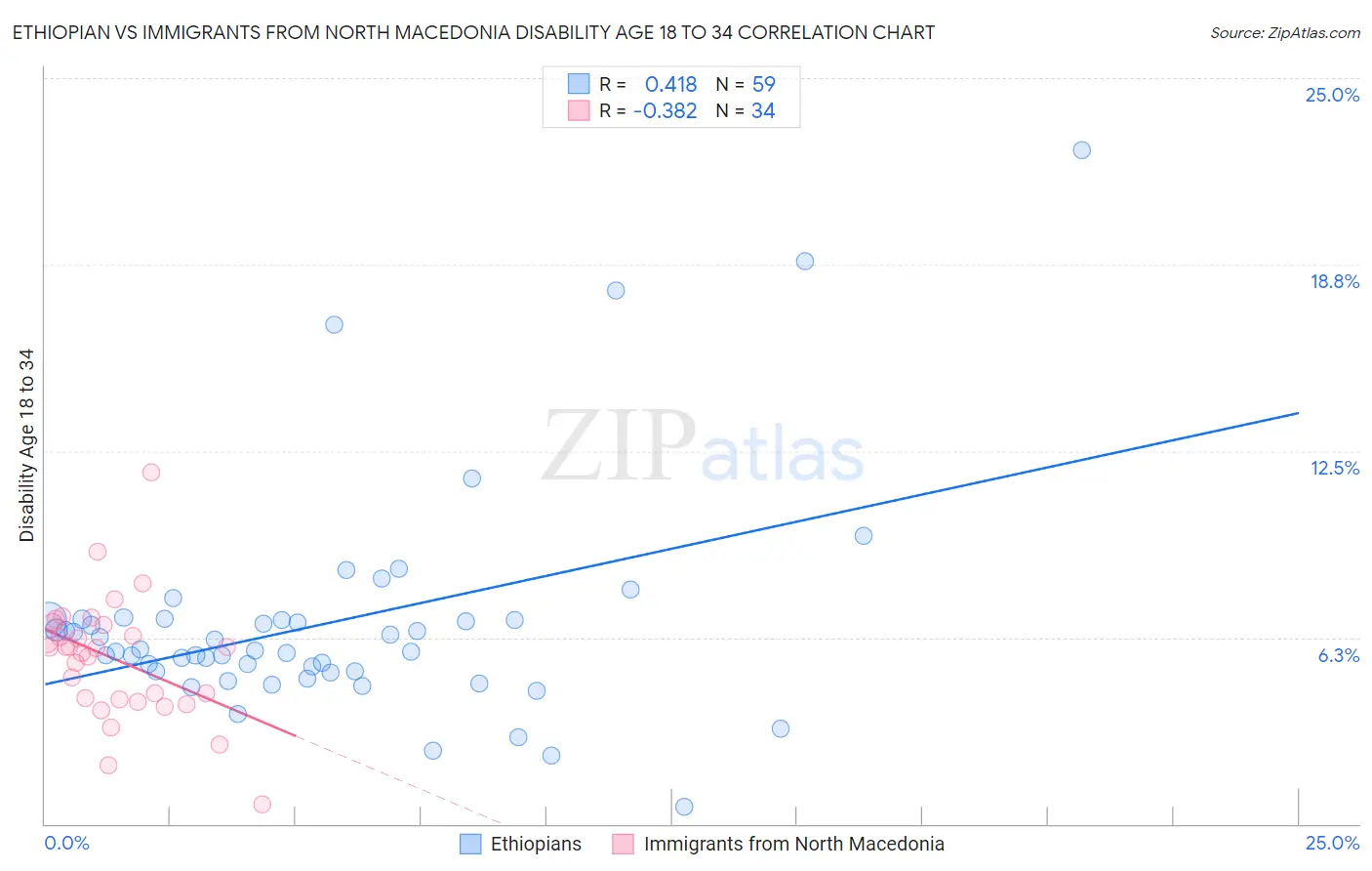 Ethiopian vs Immigrants from North Macedonia Disability Age 18 to 34 Correlation Chart