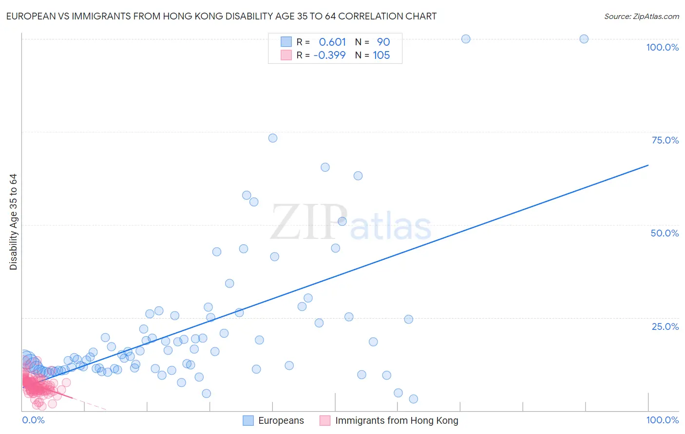 European vs Immigrants from Hong Kong Disability Age 35 to 64 Correlation Chart