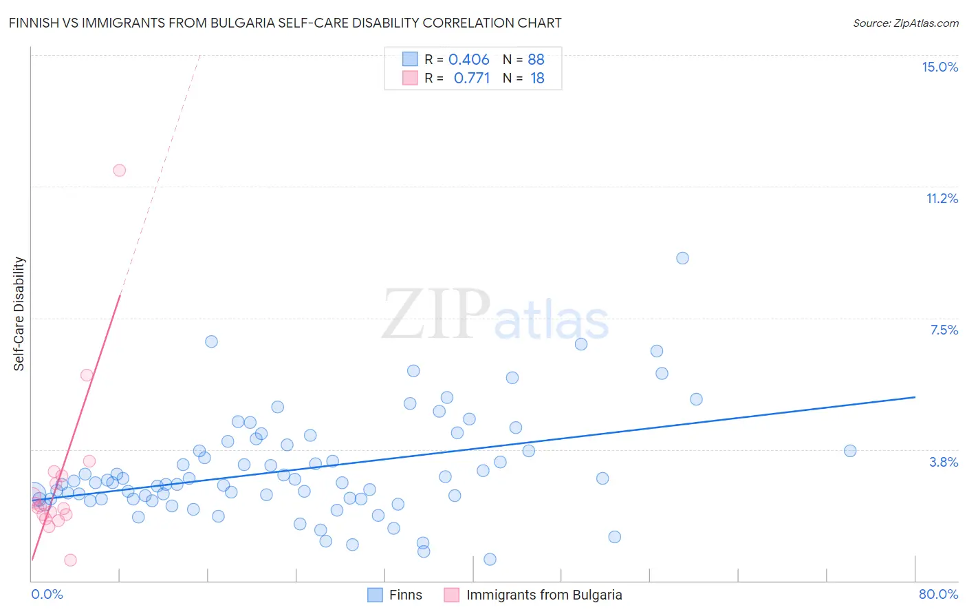 The statistical analysis conducted on geographies consisting of 404,111,559 people shows a moderate positive correlation between the proportion of Finns and percentage of population with self-care disability in the United States with a correlation coefficient (R) of 0.406 and weighted average of 2.4%. Similarly, the statistical analysis conducted on geographies consisting of 172,509,254 people shows a strong positive correlation between the proportion of Immigrants from Bulgaria and percentage of population with self-care disability in the United States with a correlation coefficient (R) of 0.771 and weighted average of 2.3%, a difference of 7.4%.