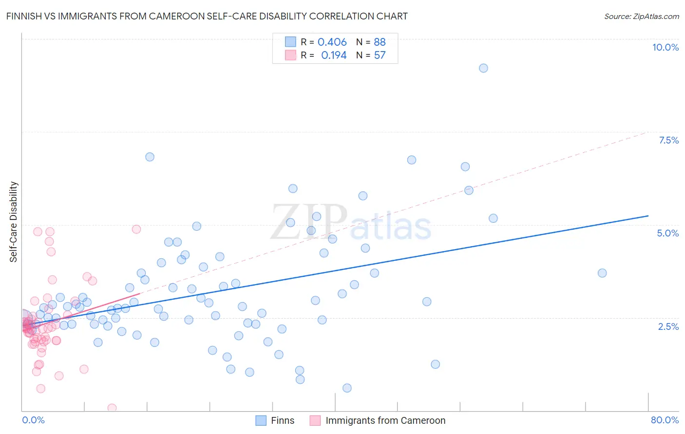 Finnish vs Immigrants from Cameroon Self-Care Disability Correlation Chart