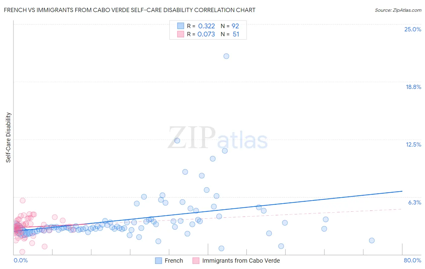 French vs Immigrants from Cabo Verde Self-Care Disability Correlation Chart