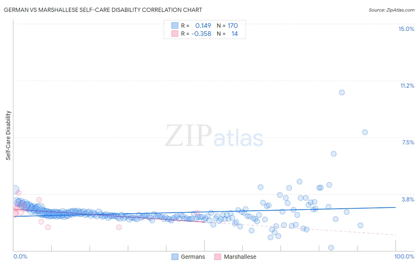 The statistical analysis conducted on geographies consisting of 577,887,813 people shows a poor positive correlation between the proportion of Germans and percentage of population with self-care disability in the United States with a correlation coefficient (R) of 0.149 and weighted average of 2.4%. Similarly, the statistical analysis conducted on geographies consisting of 14,760,594 people shows a mild negative correlation between the proportion of Marshallese and percentage of population with self-care disability in the United States with a correlation coefficient (R) of -0.358 and weighted average of 2.6%, a difference of 7.0%.