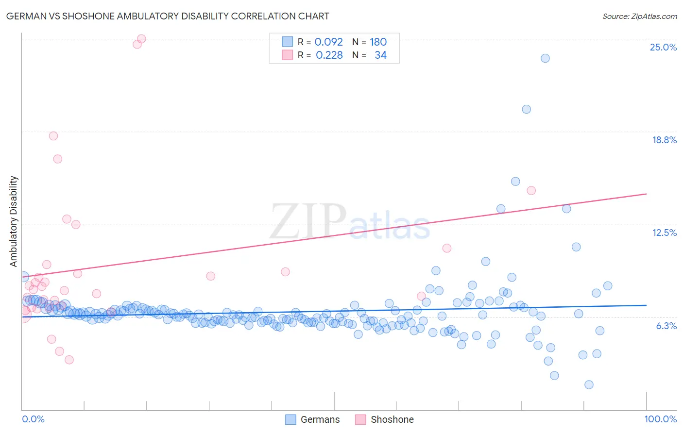 The statistical analysis conducted on geographies consisting of 580,433,029 people shows a slight positive correlation between the proportion of Germans and percentage of population with ambulatory disability in the United States with a correlation coefficient (R) of 0.092 and weighted average of 6.5%. Similarly, the statistical analysis conducted on geographies consisting of 66,618,747 people shows a weak positive correlation between the proportion of Shoshone and percentage of population with ambulatory disability in the United States with a correlation coefficient (R) of 0.228 and weighted average of 7.1%, a difference of 10.5%.