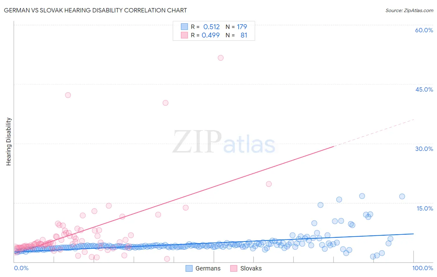 The statistical analysis conducted on geographies consisting of 580,131,605 people shows a substantial positive correlation between the proportion of Germans and percentage of population with hearing disability in the United States with a correlation coefficient (R) of 0.512 and weighted average of 3.7%. Similarly, the statistical analysis conducted on geographies consisting of 397,764,457 people shows a moderate positive correlation between the proportion of Slovaks and percentage of population with hearing disability in the United States with a correlation coefficient (R) of 0.499 and weighted average of 3.6%, a difference of 3.6%.