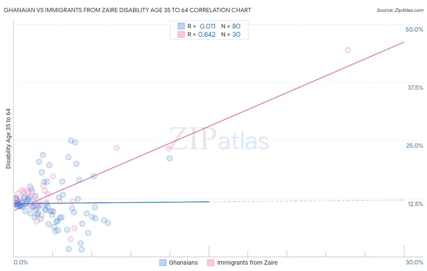 Ghanaian vs Immigrants from Zaire Disability Age 35 to 64 Correlation Chart