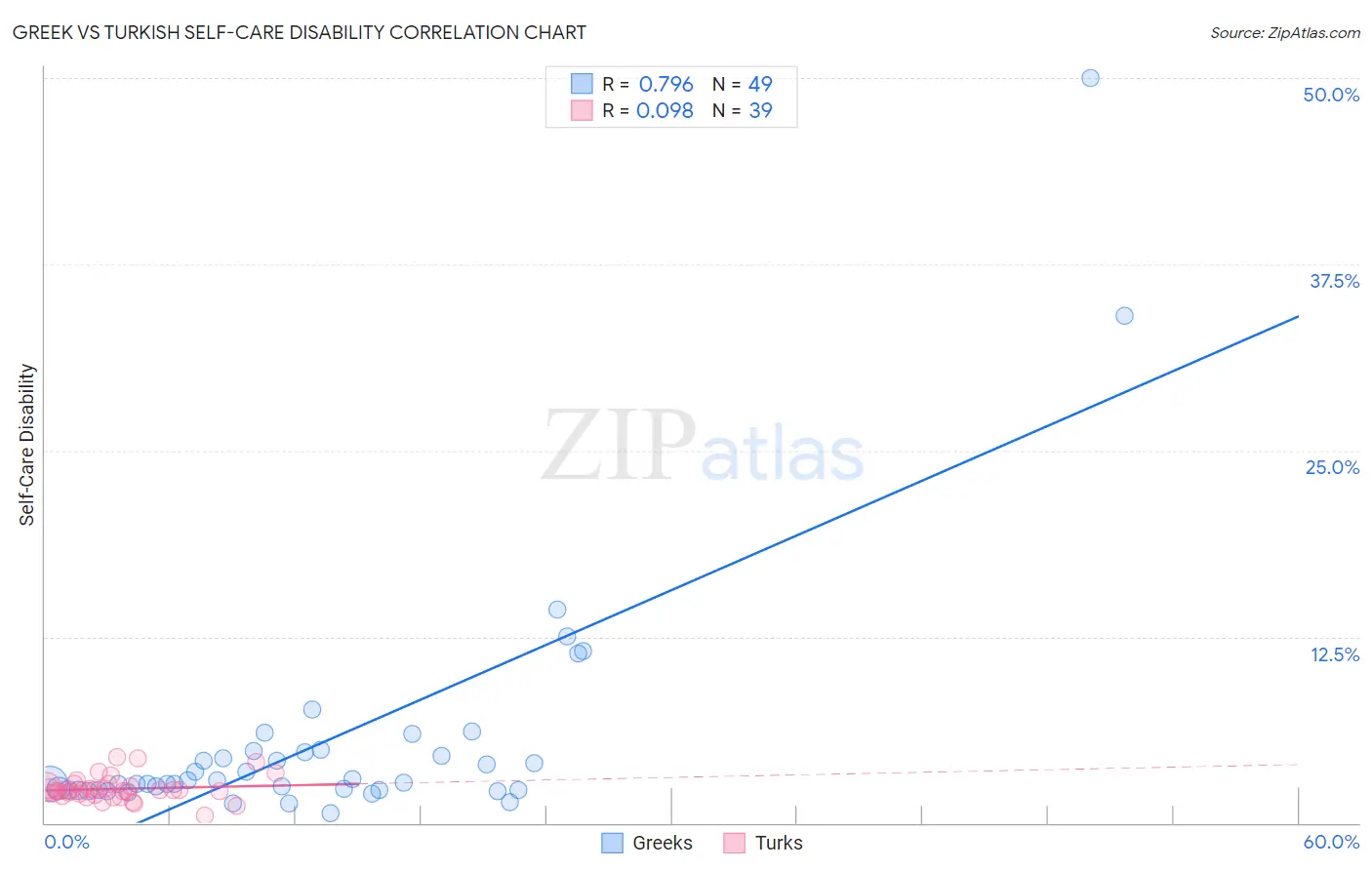 The statistical analysis conducted on geographies consisting of 481,876,170 people shows a strong positive correlation between the proportion of Greeks and percentage of population with self-care disability in the United States with a correlation coefficient (R) of 0.796 and weighted average of 2.4%. Similarly, the statistical analysis conducted on geographies consisting of 271,627,212 people shows a slight positive correlation between the proportion of Turks and percentage of population with self-care disability in the United States with a correlation coefficient (R) of 0.098 and weighted average of 2.2%, a difference of 6.4%.