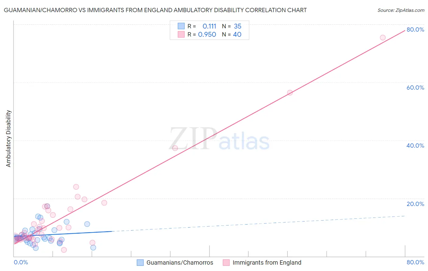 Guamanian/Chamorro vs Immigrants from England Ambulatory Disability Correlation Chart