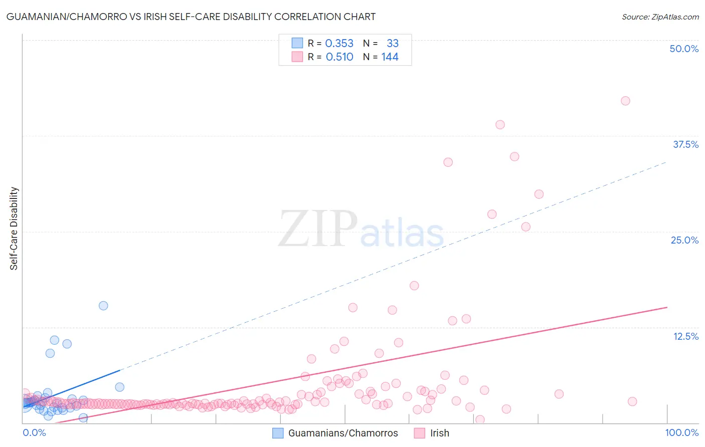 Guamanian/Chamorro vs Irish Self-Care Disability Correlation Chart