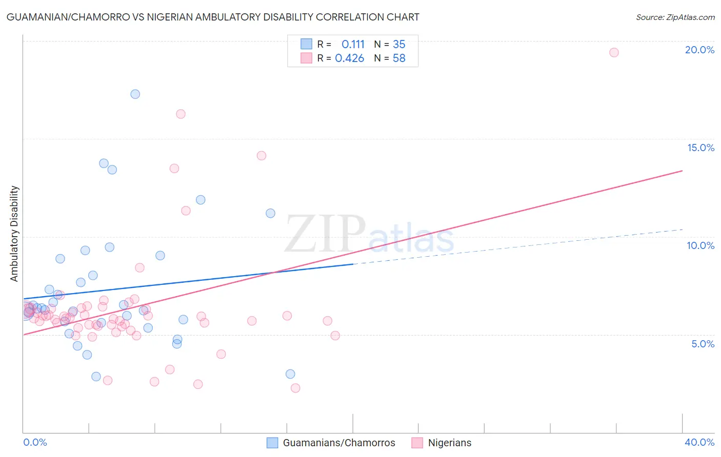 The statistical analysis conducted on geographies consisting of 221,865,083 people shows a poor positive correlation between the proportion of Guamanians/Chamorros and percentage of population with ambulatory disability in the United States with a correlation coefficient (R) of 0.111 and weighted average of 6.3%. Similarly, the statistical analysis conducted on geographies consisting of 332,639,431 people shows a moderate positive correlation between the proportion of Nigerians and percentage of population with ambulatory disability in the United States with a correlation coefficient (R) of 0.426 and weighted average of 6.1%, a difference of 3.8%.