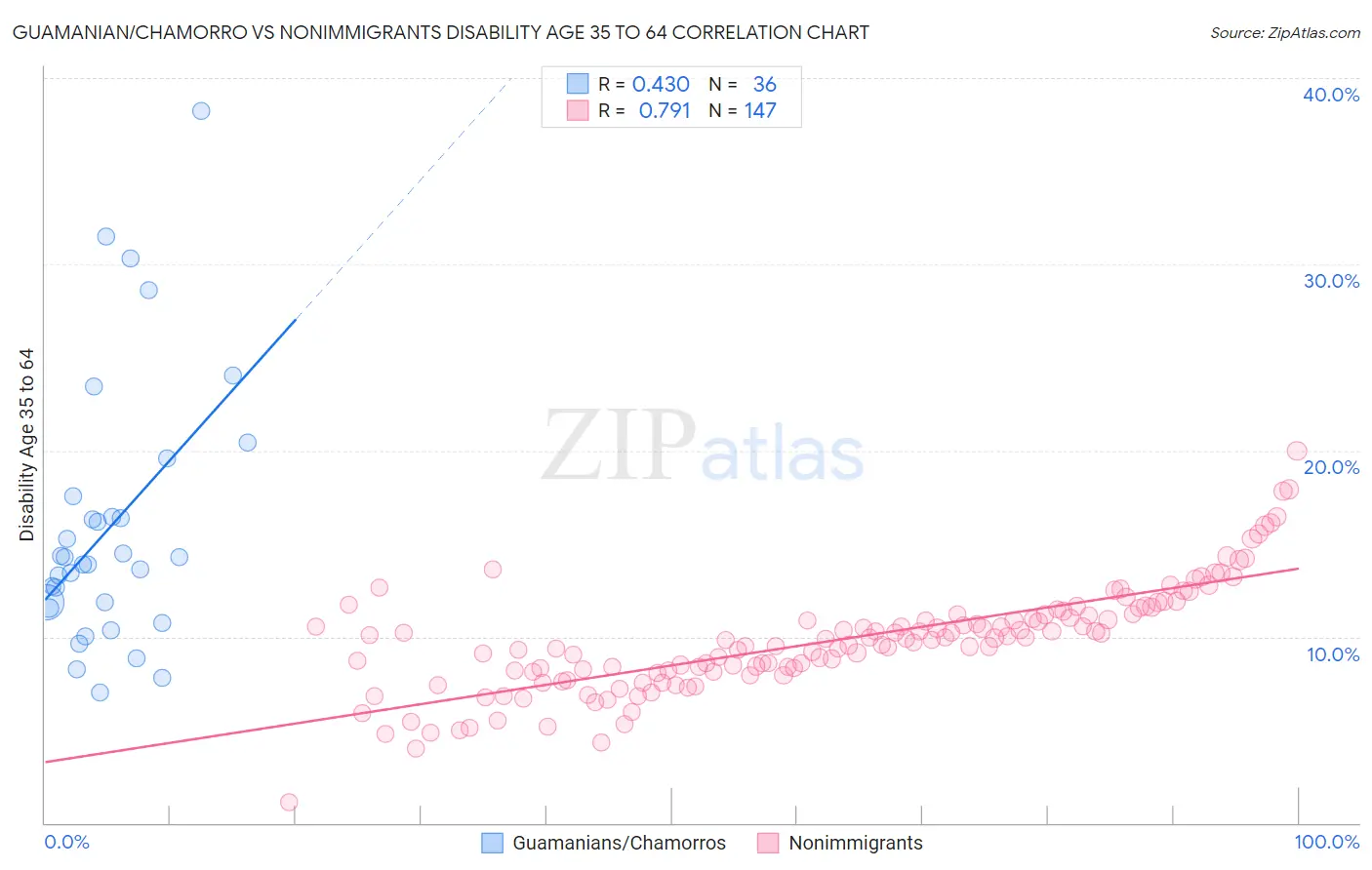 Guamanian/Chamorro vs Nonimmigrants Disability Age 35 to 64 Correlation Chart