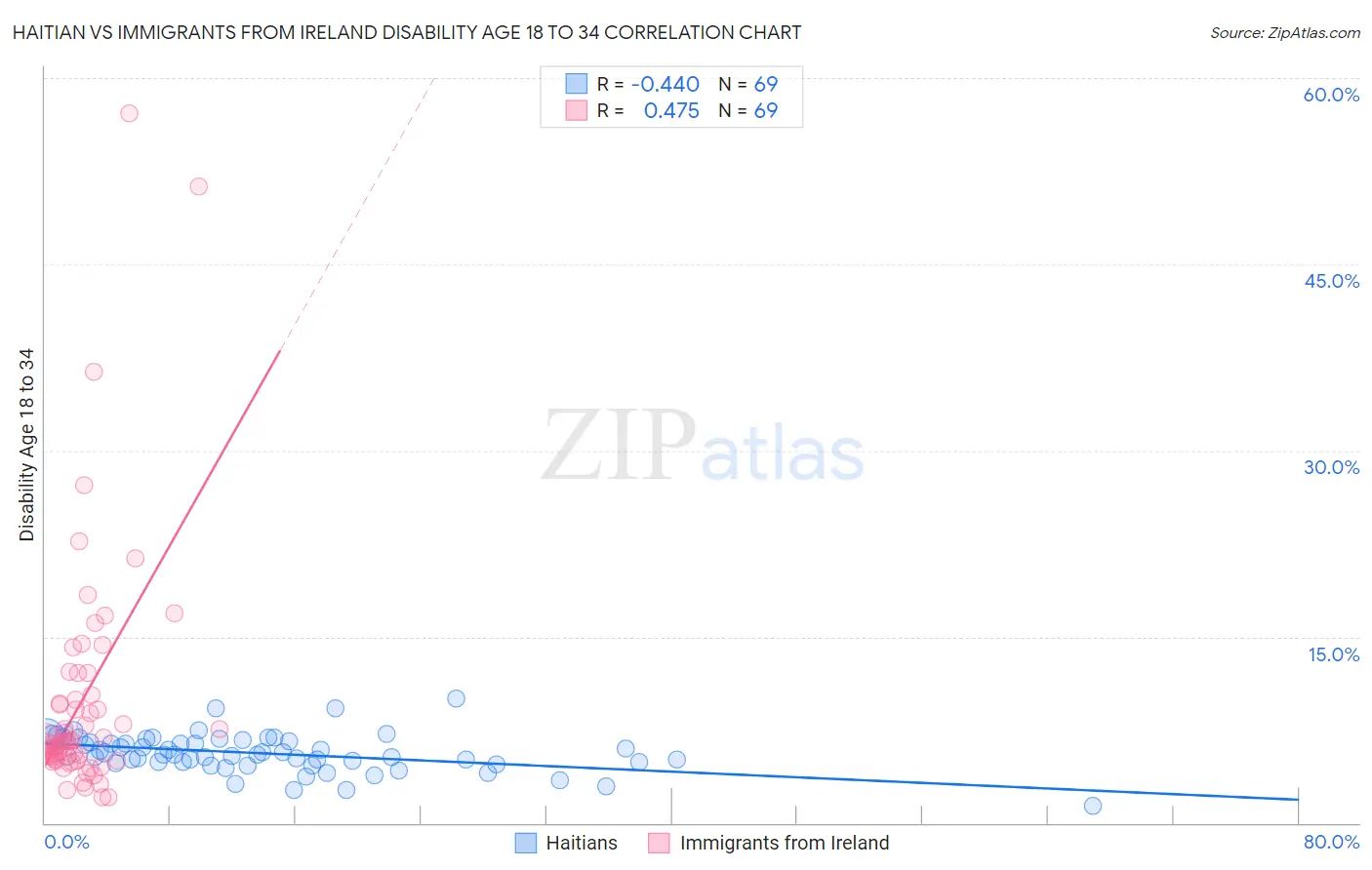 Haitian vs Immigrants from Ireland Disability Age 18 to 34 Correlation Chart