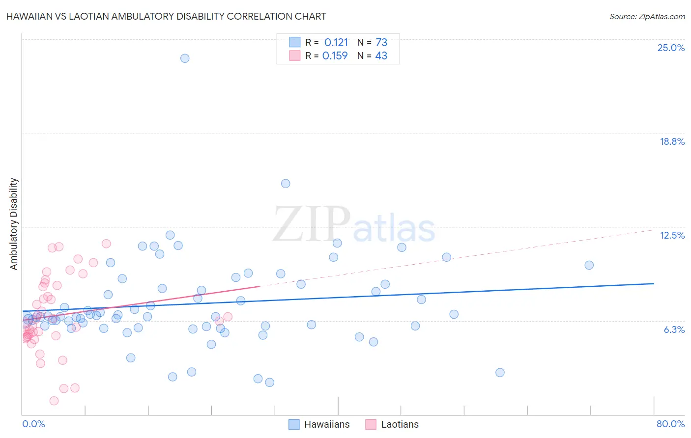 The statistical analysis conducted on geographies consisting of 327,430,219 people shows a poor positive correlation between the proportion of Hawaiians and percentage of population with ambulatory disability in the United States with a correlation coefficient (R) of 0.121 and weighted average of 6.5%. Similarly, the statistical analysis conducted on geographies consisting of 224,814,363 people shows a poor positive correlation between the proportion of Laotians and percentage of population with ambulatory disability in the United States with a correlation coefficient (R) of 0.159 and weighted average of 5.7%, a difference of 15.0%.