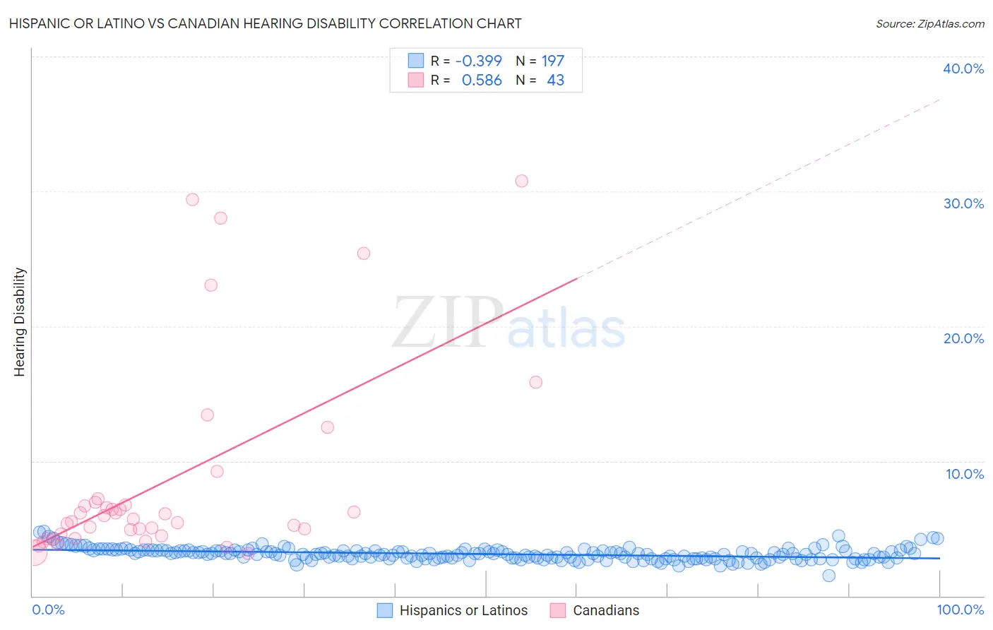 Hispanic or Latino vs Canadian Hearing Disability Correlation Chart