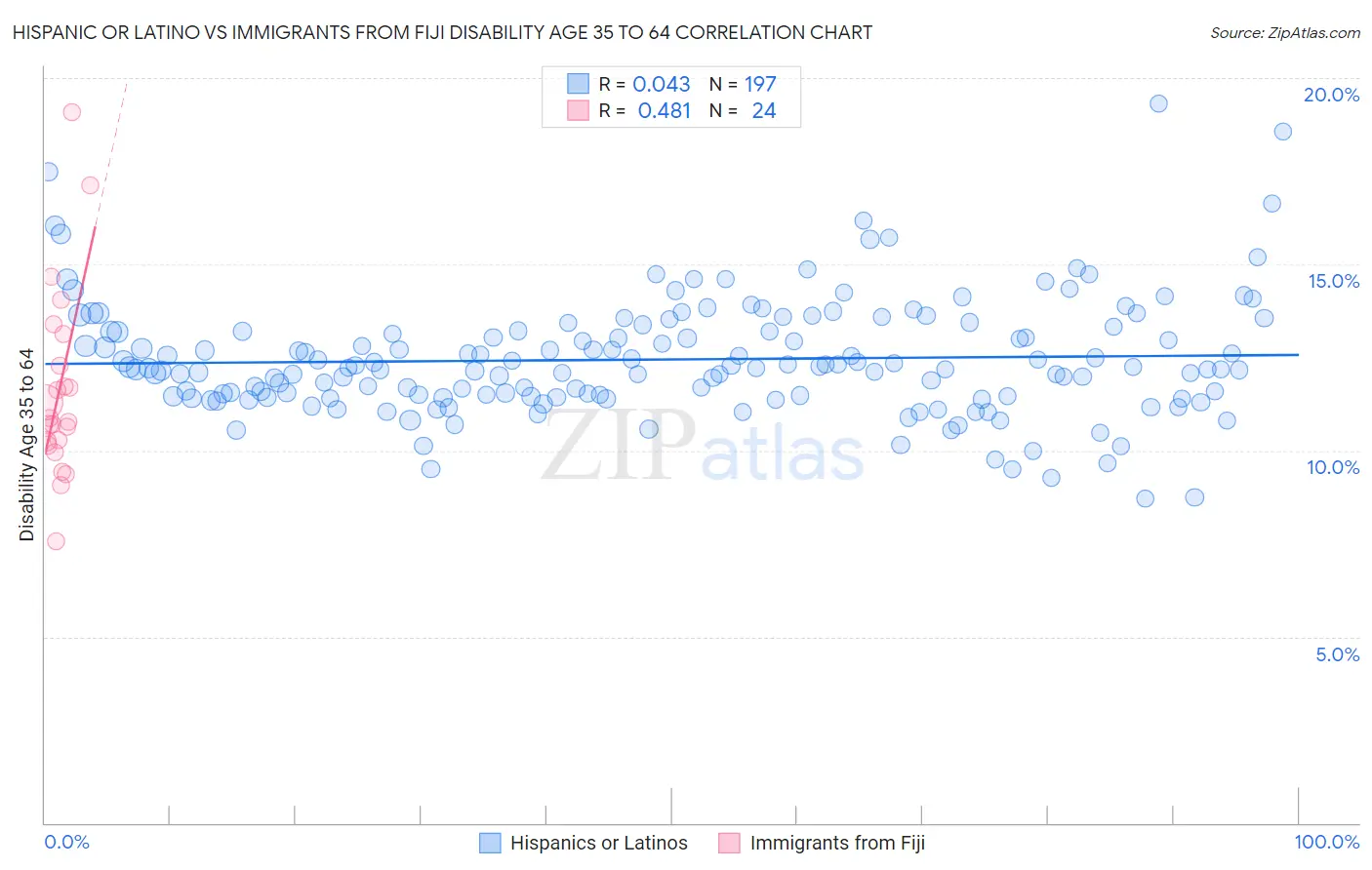 Hispanic or Latino vs Immigrants from Fiji Disability Age 35 to 64 Correlation Chart