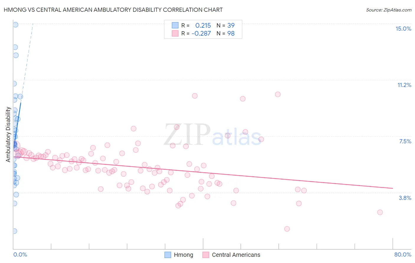 The statistical analysis conducted on geographies consisting of 24,680,511 people shows a weak positive correlation between the proportion of Hmong and percentage of population with ambulatory disability in the United States with a correlation coefficient (R) of 0.215 and weighted average of 6.6%. Similarly, the statistical analysis conducted on geographies consisting of 504,305,341 people shows a weak negative correlation between the proportion of Central Americans and percentage of population with ambulatory disability in the United States with a correlation coefficient (R) of -0.287 and weighted average of 6.0%, a difference of 8.8%.