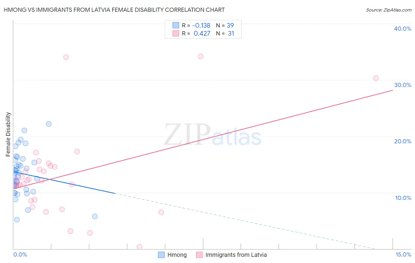 Hmong vs Immigrants from Latvia Female Disability Correlation Chart
