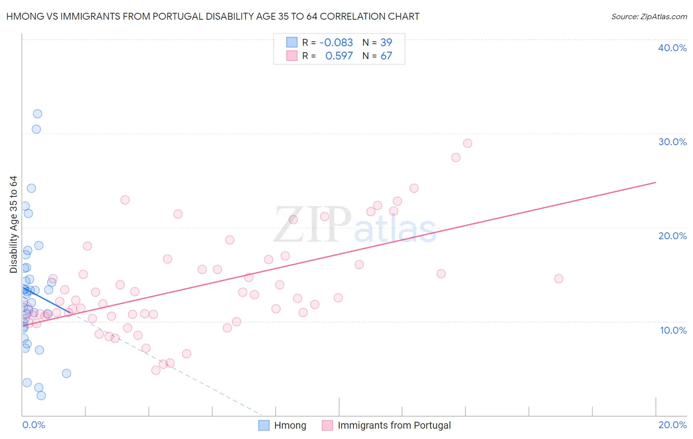 Hmong vs Immigrants from Portugal Disability Age 35 to 64 Correlation Chart