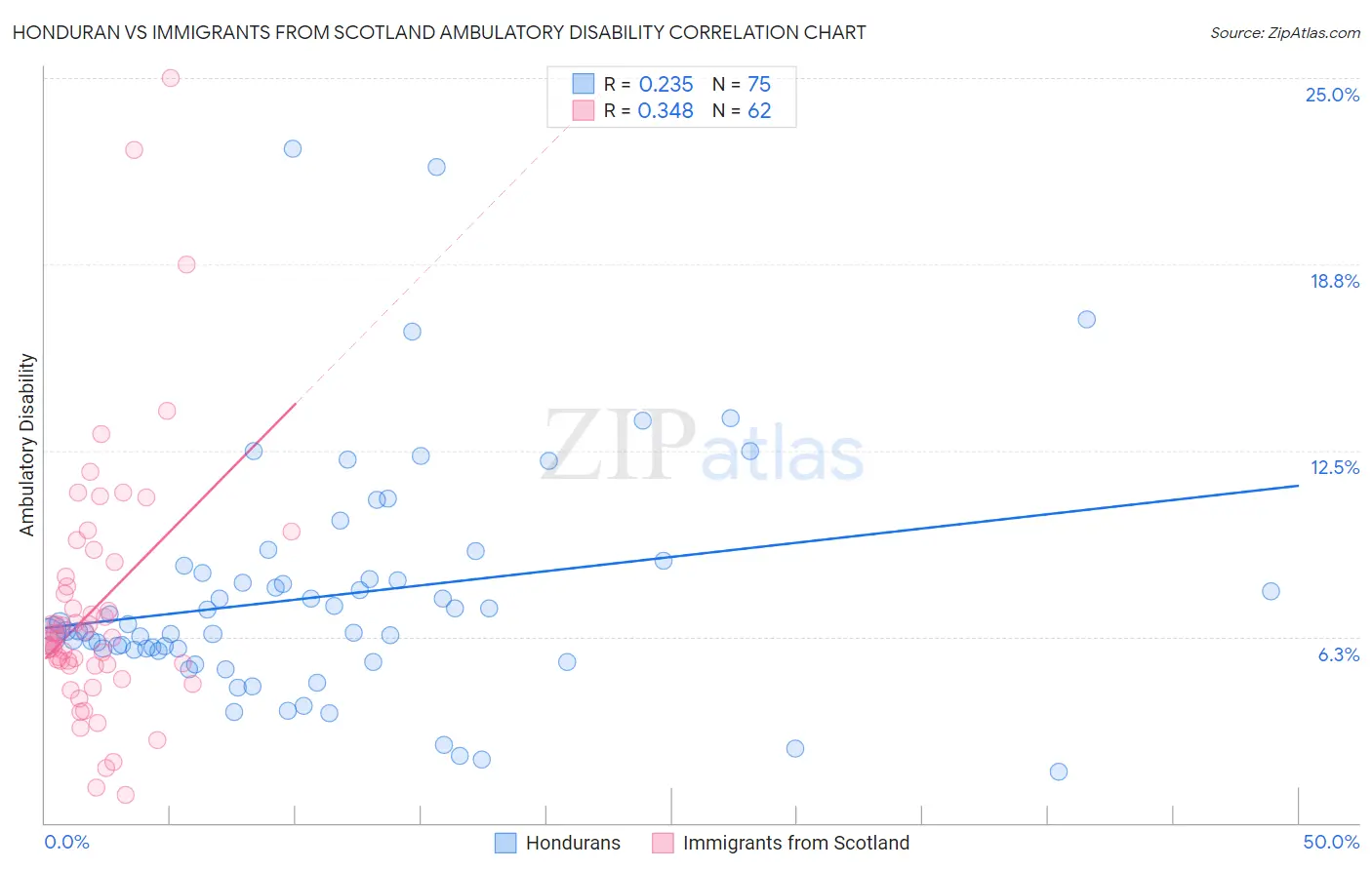 Honduran vs Immigrants from Scotland Ambulatory Disability Correlation Chart