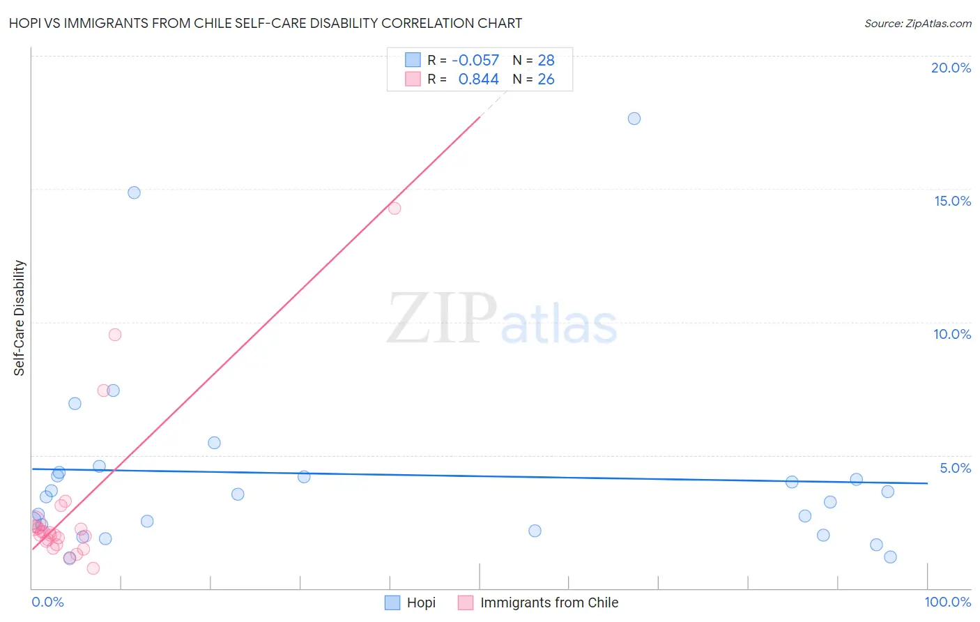 Hopi vs Immigrants from Chile Self-Care Disability Correlation Chart
