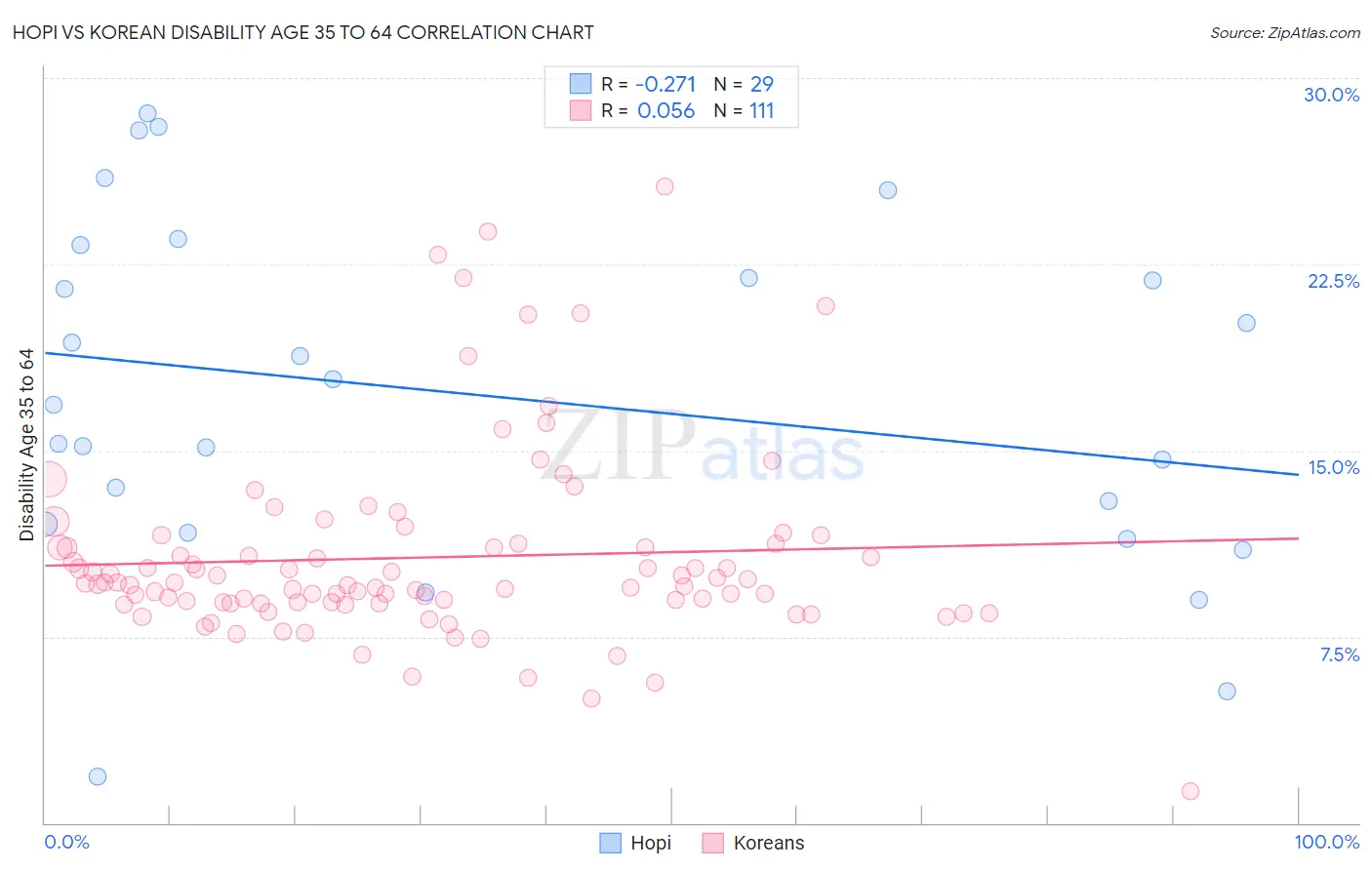Hopi vs Korean Disability Age 35 to 64 Correlation Chart