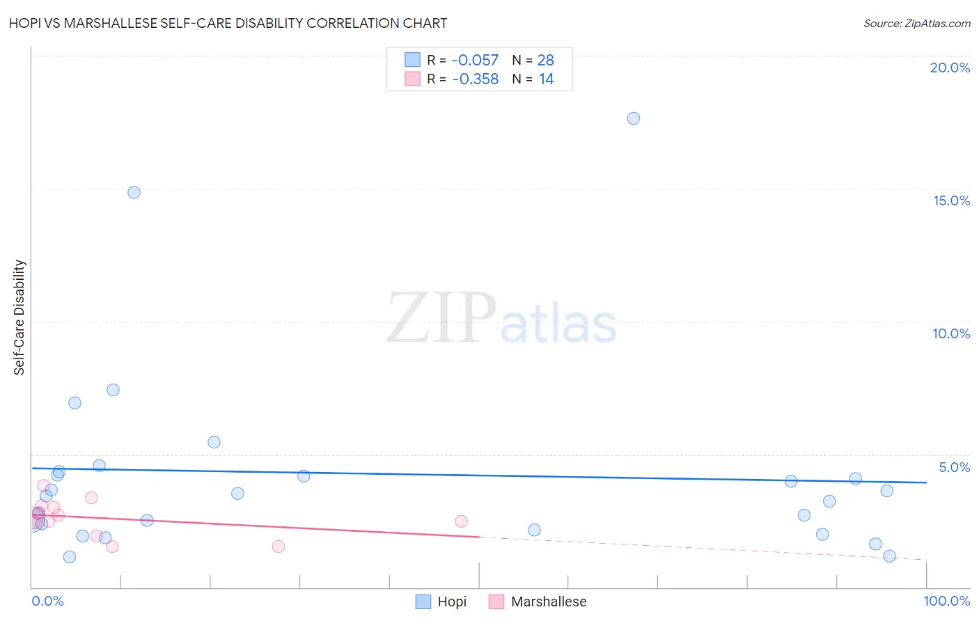 The statistical analysis conducted on geographies consisting of 74,708,657 people shows a slight negative correlation between the proportion of Hopi and percentage of population with self-care disability in the United States with a correlation coefficient (R) of -0.057 and weighted average of 2.9%. Similarly, the statistical analysis conducted on geographies consisting of 14,760,594 people shows a mild negative correlation between the proportion of Marshallese and percentage of population with self-care disability in the United States with a correlation coefficient (R) of -0.358 and weighted average of 2.6%, a difference of 13.0%.