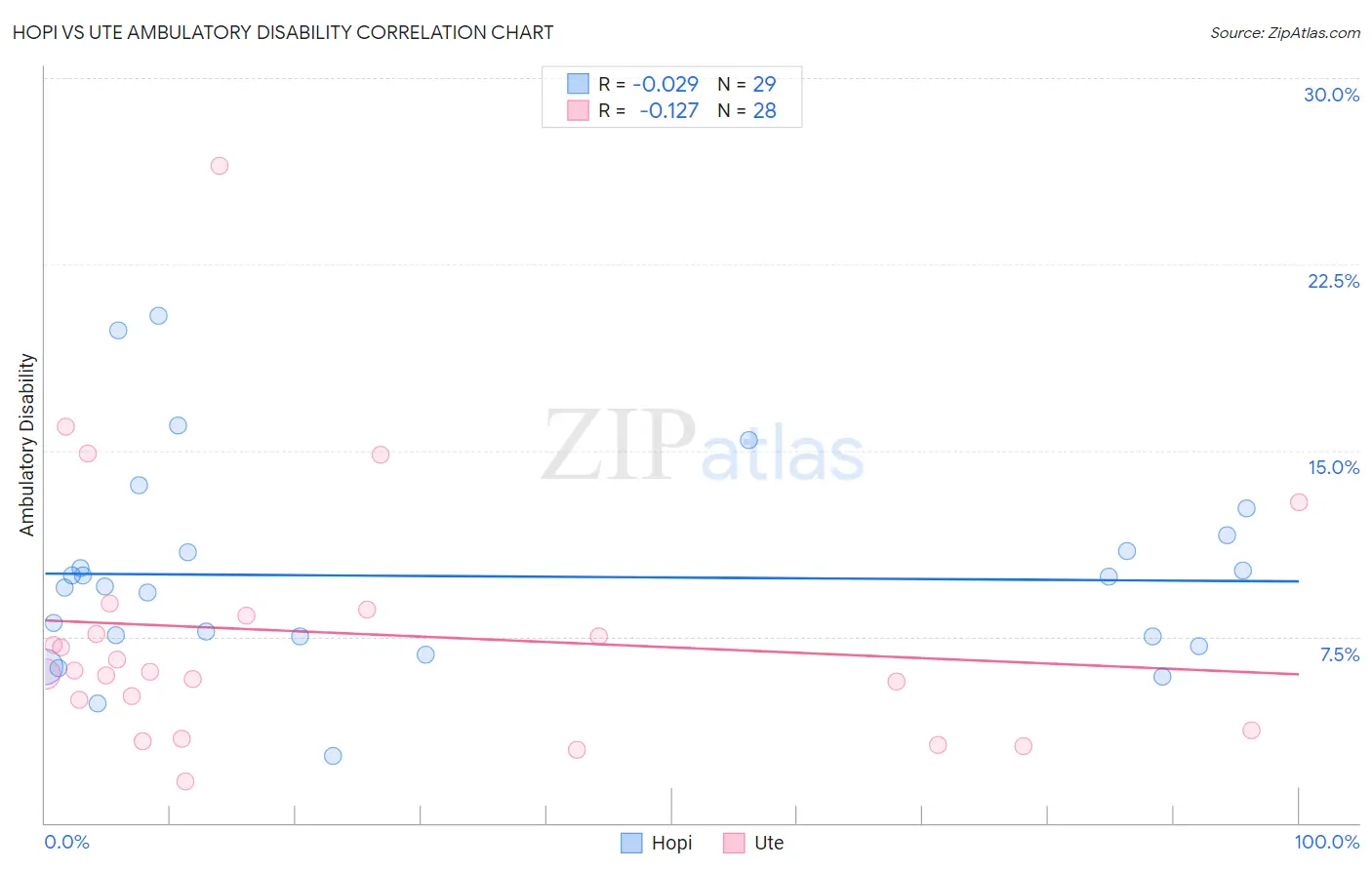 The statistical analysis conducted on geographies consisting of 74,727,187 people shows no correlation between the proportion of Hopi and percentage of population with ambulatory disability in the United States with a correlation coefficient (R) of -0.029 and weighted average of 7.6%. Similarly, the statistical analysis conducted on geographies consisting of 55,667,207 people shows a poor negative correlation between the proportion of Ute and percentage of population with ambulatory disability in the United States with a correlation coefficient (R) of -0.127 and weighted average of 6.0%, a difference of 27.3%.