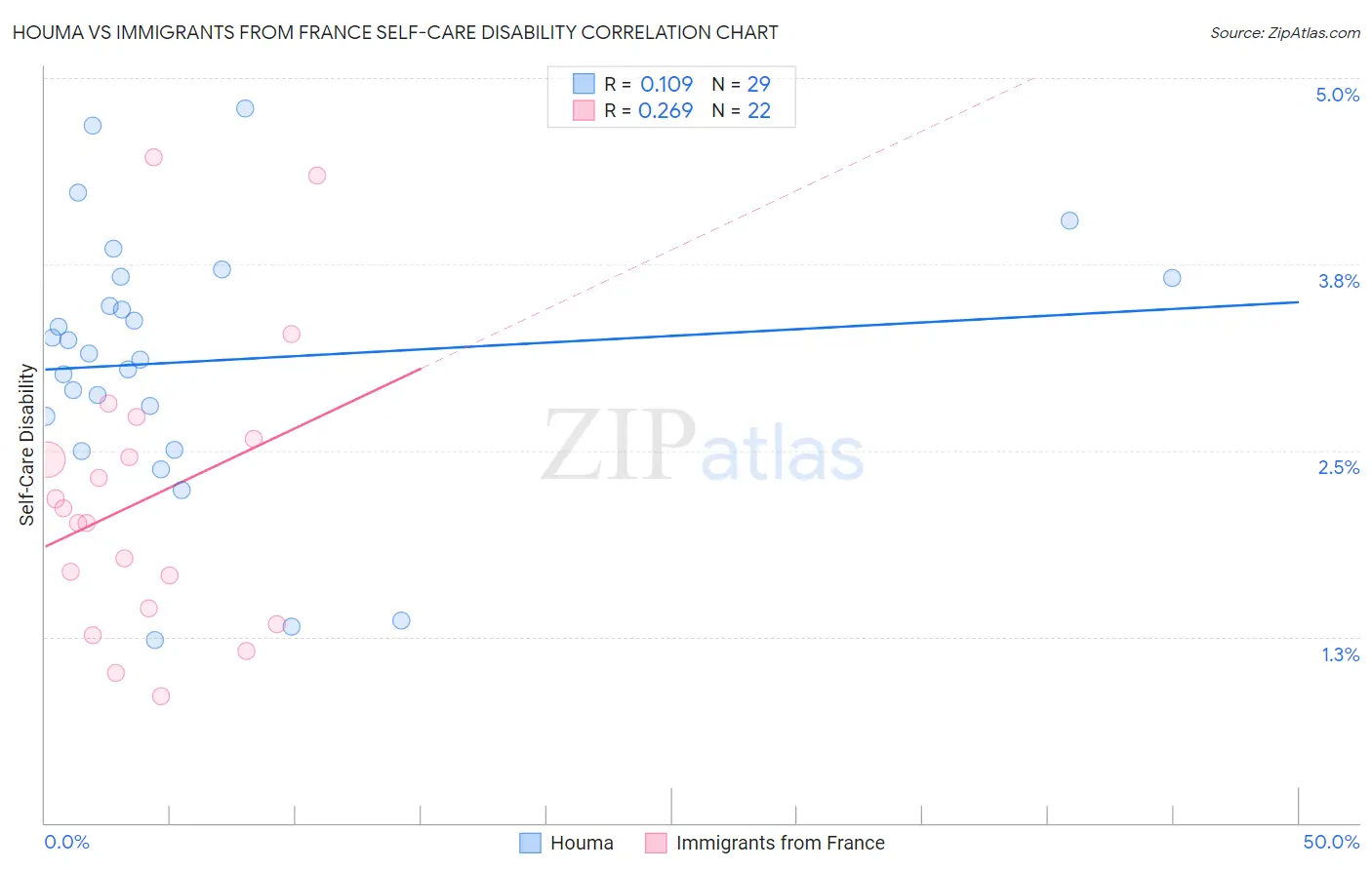 Houma vs Immigrants from France Self-Care Disability Correlation Chart