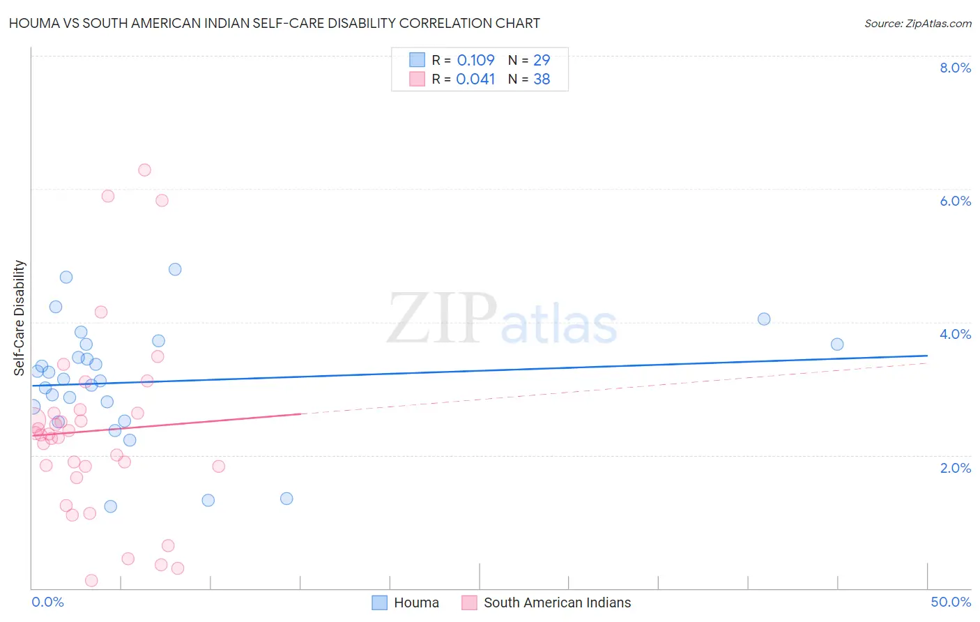 The statistical analysis conducted on geographies consisting of 36,783,442 people shows a poor positive correlation between the proportion of Houma and percentage of population with self-care disability in the United States with a correlation coefficient (R) of 0.109 and weighted average of 3.0%. Similarly, the statistical analysis conducted on geographies consisting of 164,517,360 people shows no correlation between the proportion of South American Indians and percentage of population with self-care disability in the United States with a correlation coefficient (R) of 0.041 and weighted average of 2.4%, a difference of 23.9%.