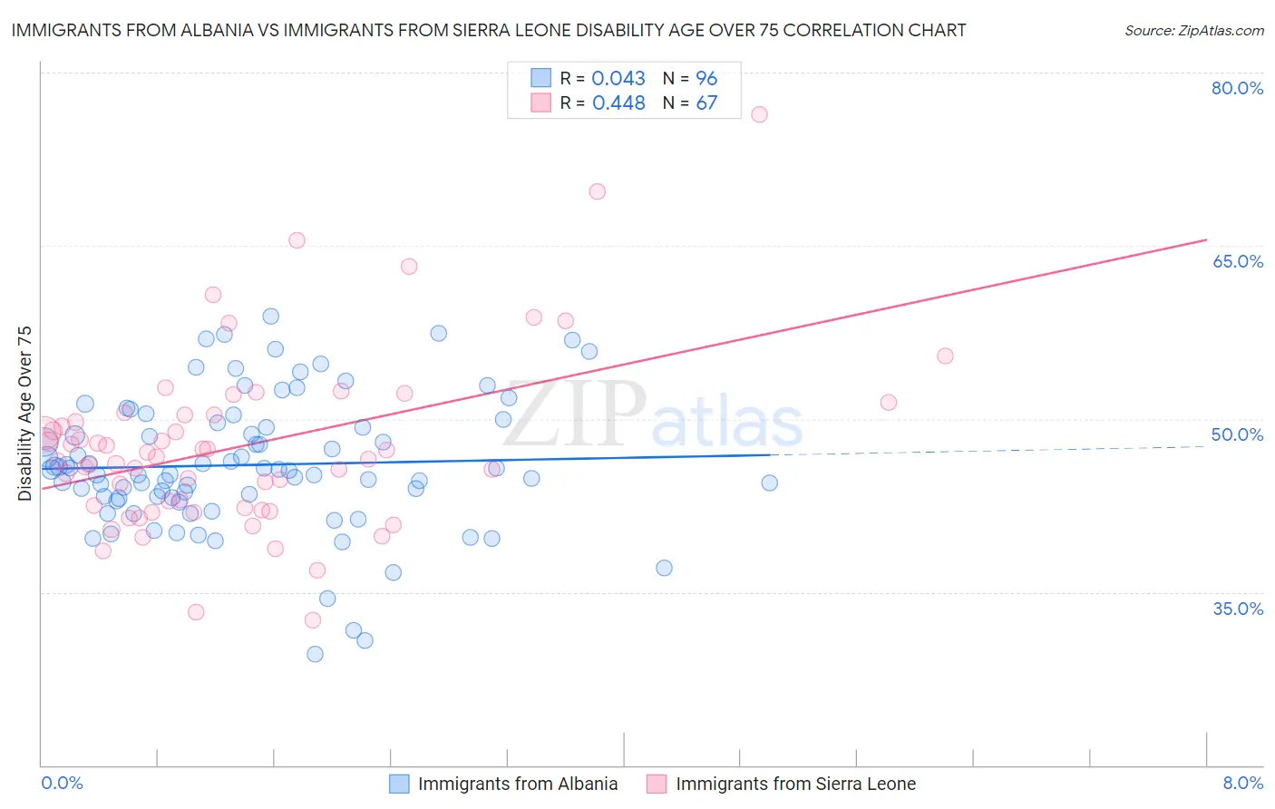 Immigrants from Albania vs Immigrants from Sierra Leone Disability Age Over 75 Correlation Chart