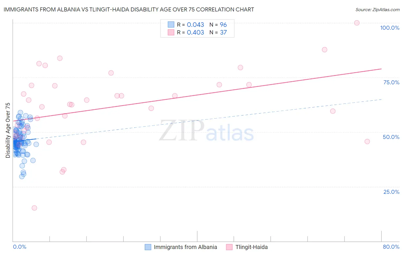 Immigrants from Albania vs Tlingit-Haida Disability Age Over 75 Correlation Chart