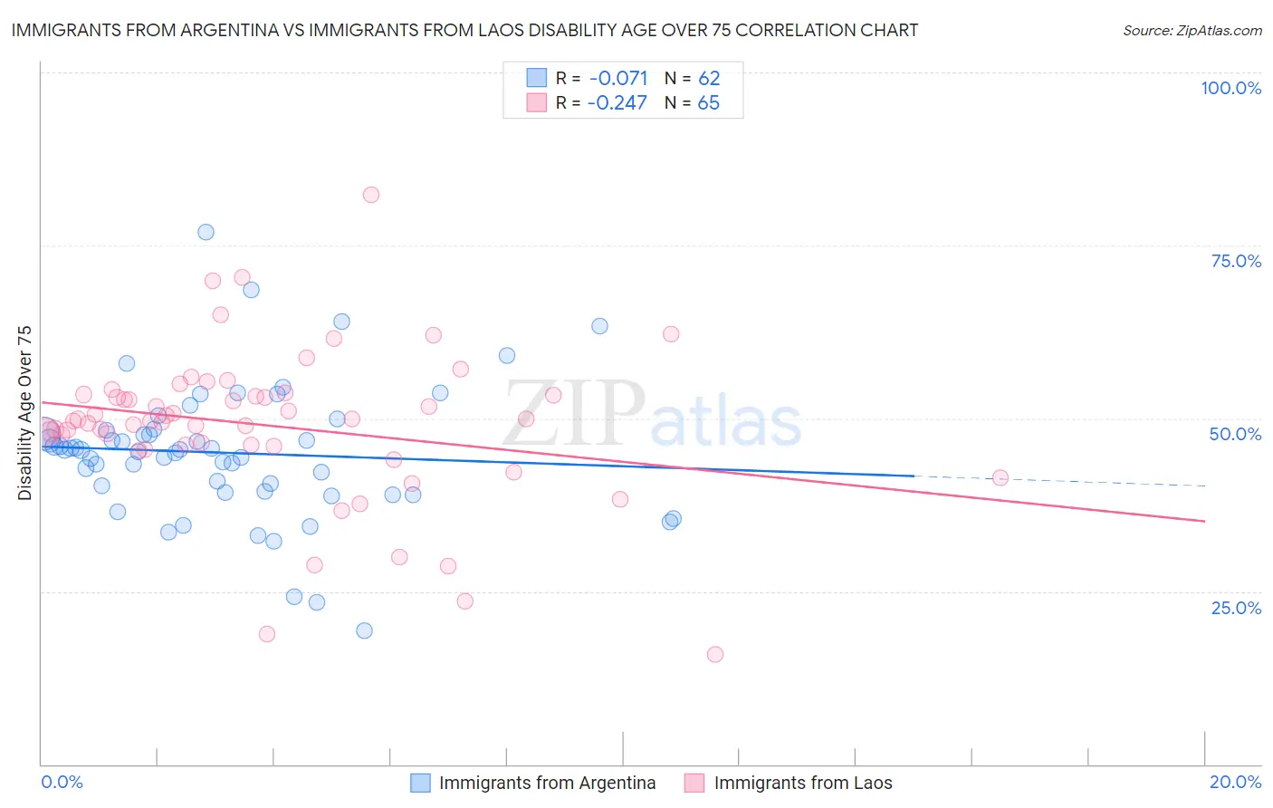 Immigrants from Argentina vs Immigrants from Laos Disability Age Over 75 Correlation Chart
