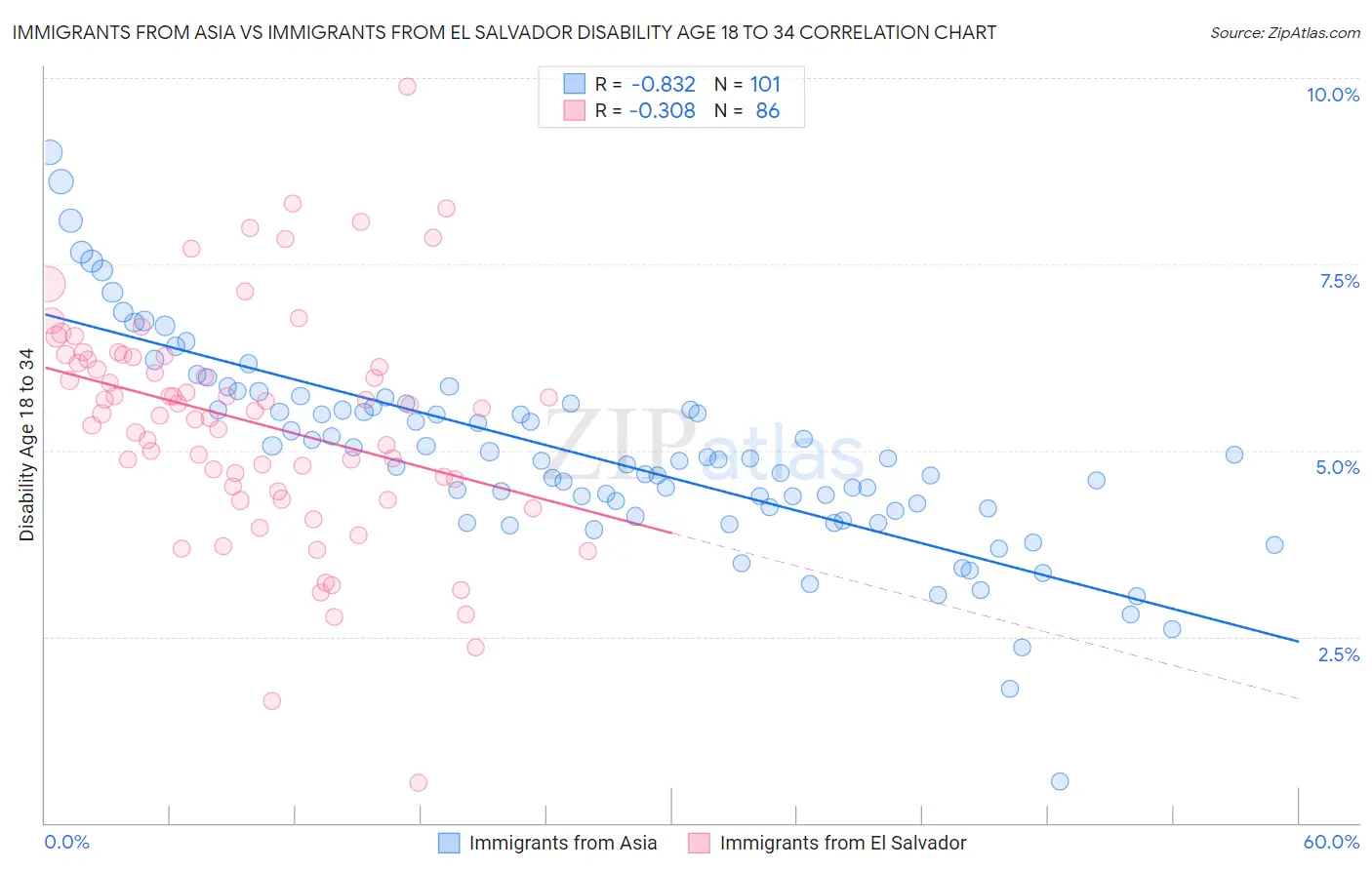 Immigrants from Asia vs Immigrants from El Salvador Disability Age 18 to 34 Correlation Chart