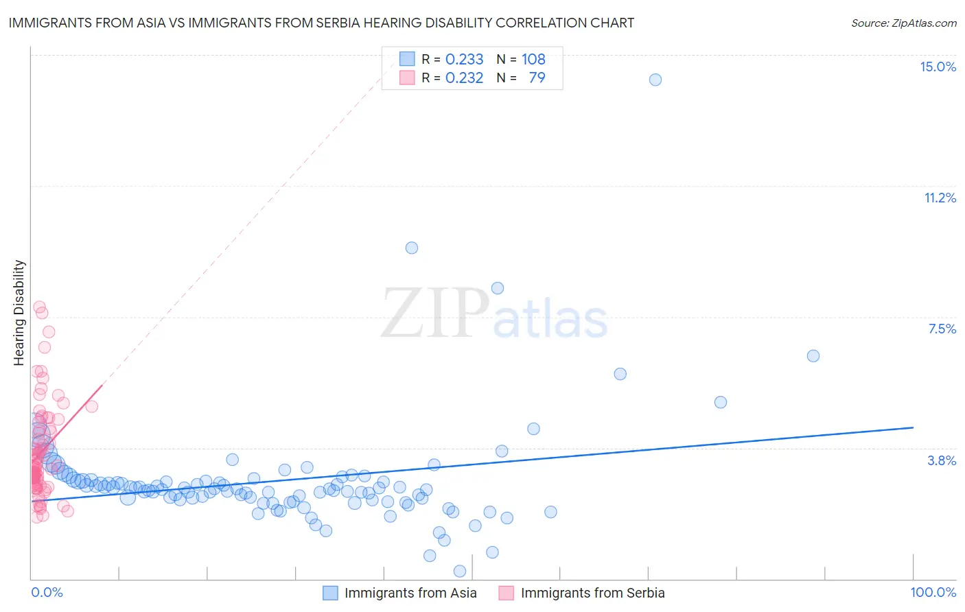 Immigrants from Asia vs Immigrants from Serbia Hearing Disability Correlation Chart