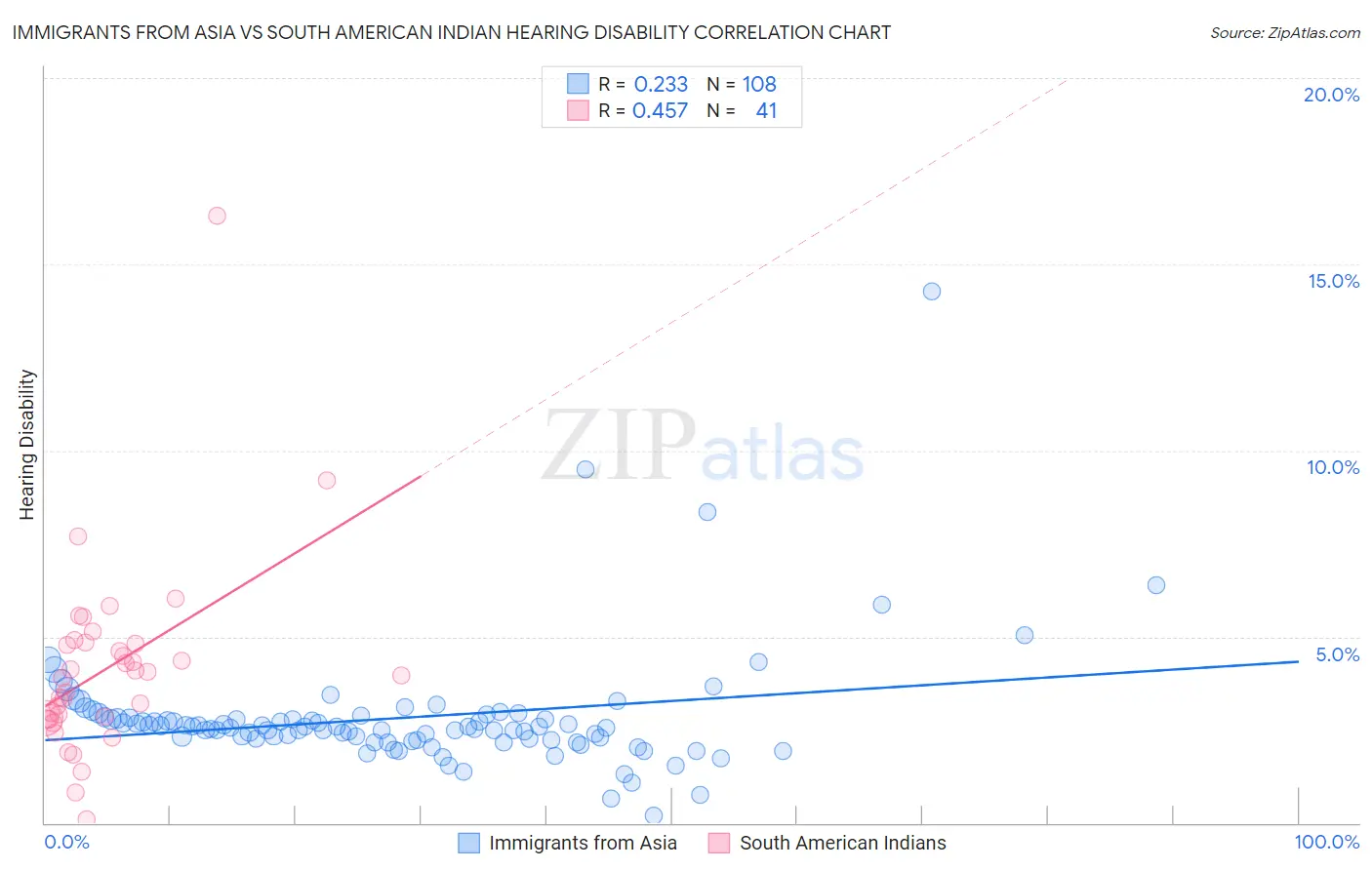 Immigrants from Asia vs South American Indian Hearing Disability Correlation Chart