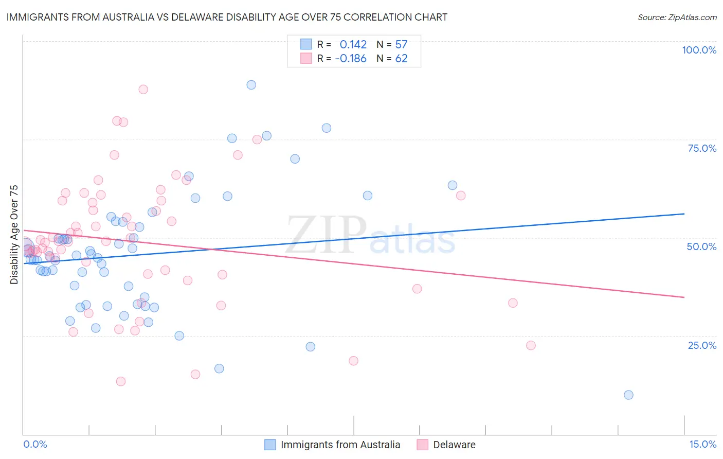 Immigrants from Australia vs Delaware Disability Age Over 75 Correlation Chart