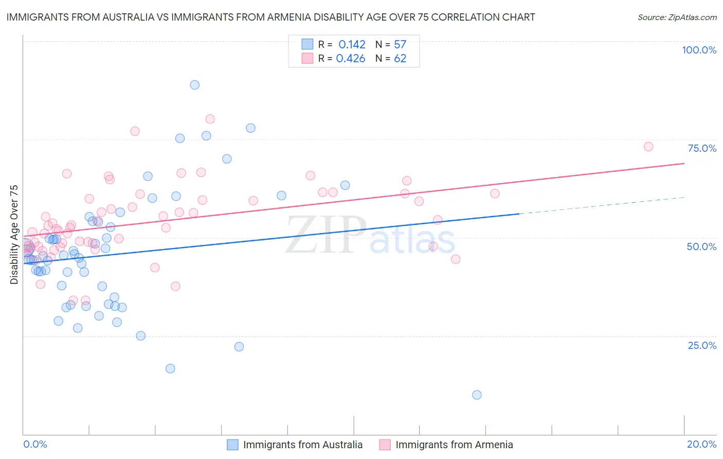 Immigrants from Australia vs Immigrants from Armenia Disability Age Over 75 Correlation Chart