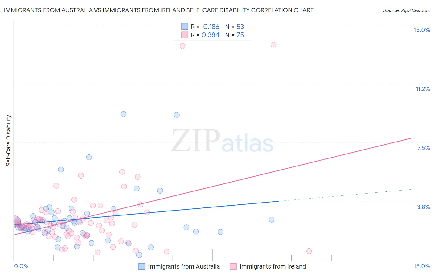The statistical analysis conducted on geographies consisting of 227,025,526 people shows a poor positive correlation between the proportion of Immigrants from Australia and percentage of population with self-care disability in the United States with a correlation coefficient (R) of 0.186 and weighted average of 2.3%. Similarly, the statistical analysis conducted on geographies consisting of 240,643,513 people shows a mild positive correlation between the proportion of Immigrants from Ireland and percentage of population with self-care disability in the United States with a correlation coefficient (R) of 0.384 and weighted average of 2.3%, a difference of 2.8%.