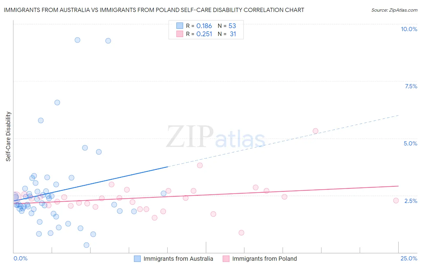 Immigrants from Australia vs Immigrants from Poland Self-Care Disability Correlation Chart
